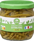 Carrefour's Cut Extra Fine French Beans are pre-cut and ready to use straight from the can, with no need for further preparation. Simply drain the beans and rinse briefly under cool water. They can be warmed in a pan with a dash of olive oil and your favorite spices, added to salads for extra crunch, or served as a side dish to complement main meals.