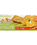 Introducing the Soy And Orange Biscuits from Carrefour, a delectable and healthy treat perfect for those who crave balanced sweetness in their snacks. Made with 48.1% wheat flour and enriched with a beneficial blend of wheat germ, soy flakes, and rapeseed oil, these biscuits serve as a great source of vitamins and magnesium. The refreshing zest of orange, combined with a hint of natural orange flavor, enhances the biscuit's taste and provides a unique flavor profile that will make you reach for another one.