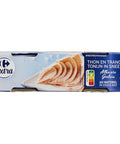 Experience the rich taste of the sea with Carrefour's Albacore Tuna Chunks Natural - Pack. Each can is packed with protein-rich yellowfin tuna, caught at its peak, and preserved in a simple brine of pure water and salt. This means you're getting nothing but the best quality tuna, as pure as its natural habitat. No artificial flavors or additives, just the authentic, bold taste of fresh tuna. This makes it a perfect pantry staple for health-conscious individuals or those following a high-protein diet.