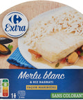 Indulge in the flavours of the sea with Carrefour's White Hake in Mariniere Sauce with Basmati Rice. This ready-made dish brings together the succulence of white hake fillets, the saltiness of Pacific mussels, and the delicate sweetness of basmati rice. All these are beautifully combined in a rich marinier sauce that bursts with the freshness of leeks, shallots, and aromatic plants, and the subtle tanginess of white wine and lemon juice. The inclusion of a range of natural extracts, spices, and fresh cream further enhances the taste and aroma of this dish. Experience and enjoy the delectable and balanced blend of flavours right in the comfort of your home.