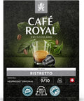 Start your day with the bold and robust flavor of Café Royal's Ristretto Coffee Capsules - Intensity 9. Made from 100% Arabica beans, these capsules deliver a rich and intense coffee experience right in the comfort of your home. The high intensity of the Ristretto provides a full-bodied coffee with a smooth finish, perfect for those who appreciate a strong cup to kick-start their day. Our coffee capsules are not only guaranteed to be tasty but also environmentally friendly.