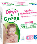 Introducing Love & Green's Hypoallergenic And Ecolabellised Nappies T5, designed specifically for babies in the weight range of 11 to 25kg. These nappies are crafted from 100% FSC certified cellulose from responsibly managed forests and feature an absorbent cushion of copolymer microbeads. With a skin-contact veil made from biobased materials, they are great for your baby's delicate skin and for the environment too. The eco-label signifies our commitment to sustainability, and the nappies are free from chlorine, colorants, petrolatum, and paraffin, ensuring they are as natural and pure as possible. Dermatologically controlled, they are also hypoallergenic providing gentle care for your little one's skin.