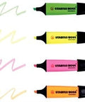 Illuminate your notes with our pack of 4 Stabilo Boss Highlighters, available in a vibrant assortment of colours - green, yellow, pink, and orange. These standard highlighters will add a splash of colour to your important documents and study notes, helping you organise your information and remember key points with ease. Each highlighter boasts a long-lasting ink supply, ensuring durability and longevity in every stroke. The fast-drying nature of the ink means no smudging or mess, making them perfect for both right and left-handed individuals.