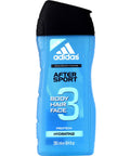 The After Sport Hydrating Shower Gel 3in1 by Adidas is the perfect partner to refresh and re-energize after an intense workout session. The all-in-one solution cleanses, refreshes, and revitalizes, offering a quick and efficient post-workout routine. Its special formula, enriched with hydrolyzed wheat protein, panthenol, and menthol, not only cleanses but also nourishes your skin and hair while providing a cooling effect. The shower gel leaves an invigorating scent that lingers, keeping you feeling fresh and vibrant throughout the day. With its balanced pH and dermatologically tested ingredients, it is suitable for daily use.