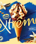 Embrace the ultimate pleasure of the perfect ice cream cone with NESTLE's Vanilla Cone Ice Cream With Nougatine Chips EXTREME. This culinary delight offers an indulgent blend of velvety smooth vanilla ice cream sprinkled with visible vanilla bean specks that bring an intense vanilla taste. Every bite is enriched by the crunch of luscious nougatine chips. Served in a crispy, delicious waffle cone, this frozen treat is crowned with a delectable EXTREME chocolate tip, transforming a simple dessert into an extraordinary taste sensation. The Rainforest Alliance Certified cocoa adds an ethical dimension, ensuring you can enjoy this indulgence guilt-free.