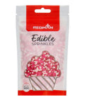 Our Decor Sprinkles are made in USA. This product is available in packets of 100g and 500g. It is available in the following designs - Hundreds and Thousands, Jingle blend, Jumbo heart, Gingerbread house, Mini red, Mini Red white & pink heart, Mocha beans, Moon & star, Red, Red white & blue star, Star & stripes, Snowflake, Twinquin festive, Candy cane peppermint, White & pink, Pumpkin shaped, Rainbow, Red & Green tree and Red hearts.