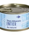 Experience the pure, natural goodness of the sea with Carrefour's Natural Whole Tuna. Hand-selected for their high-quality, these albacore tunas are carefully packed in a simple blend of water and salt. Known for its light, rich flavour and firm texture, our albacore tuna is a delicious and healthy choice. It is an excellent source of protein, vitamins, and omega-3 fatty acids that can contribute to a balanced diet. Whether you're making a classic tuna sandwich or an elegant seafood pasta, this Natural Whole Tuna from Carrefour is sure to impress with its exceptional taste and texture.