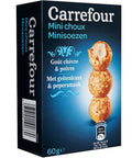 Indulge in the rich and sophisticated flavors of France with Carrefour's Mini Choux Stuffed With Goat Cheese And Pepper. Made with the finest ingredients such as pasteurized whole eggs, coconut oil, wheat flour, and sprinkles of poppy seeds, these snacks deliver a creamy, tangy goat cheese filling with just the right kick of black pepper. The savory choux pastry, traditionally light and airy, is the perfect complement to the robust cheese and pepper filling. This product is a testament to Carrefour's commitment to providing high-quality and delicious aperitif snacks.