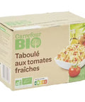 Experience Mediterranean tradition in every bite with our Organic Tabbouleh With Mint And Extra Virgin Olive Oil from the esteemed brand Carrefour. This tantalizing entrée contains a delightful mix of organic fresh tomatoes, onions, red peppers, tomato paste, parsley, and a splash of lemon juice, enhanced with an aromatic hint of dried and natural mint. The tabbouleh is further enriched with a drizzle of extra virgin olive oil and sprinkled with a touch of ground white pepper. At the heart of this dish is a bag of pre-cooked hard WHEAT semolina, boasting a rich, nutty taste that beautifully complements the freshness of the vegetables.