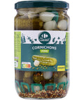 Dazzle your guests with a French-inspired charcuterie board featuring Carrefour's Fine Pickles, cured meats, cheeses, and baguette slices. Make a classic French raclette with potatoes and our pickles for a convivial family dinner. Add an exciting twist to your burgers by topping them with these tangy pickles, or create a gourmet tartare with fine pickles and capers for a dinner party appetizer.