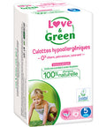 Love & Green's Hypoallergenic and Ecolabellised Pull Up Pants T5 are specially designed for the gentle protection of your baby's sensitive skin. Made from 100% cellulose certified from responsibly managed forests, these pants are non-chlorine bleached ensuring utmost safety for your child. They feature absorbent microbeads of copolymers for excellent leak protection and a skin-contact veil made of biobased materials. The pull-up pants are also eco-friendly, made with natural corn starch and a non-woven veneer of FSC certified natural origin.