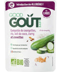 Delight your little one with our Organic Compote of Courgette, Rice, Coconut Latte, Curry and Shrimp by Good Goût. We've used 57% organic courgettes, 10% organic white rice, 8% organic prawns and 5% organic coconut milk to create a dinner dish that's not just healthy and nutritious, but also bursting with flavor. Harmoniously blending these ingredients, we've introduced a hint of organic curry to create a mild setting for introducing spices into your little one's palate. As a bonus, this dish is free from any harmful ingredients and may contain traces of celery - an excellent source of antioxidants.