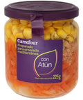 Experience a true taste of the Mediterranean with Carrefour España's Preparation for Mediterranean Salad. This delicious mix combines the authentic flavors of sweet corn, grated carrot, asparagus buds, and both black and green olives. Added to this vegetable blend are enticing tuna crumbs in sunflower oil, all seasoned with white wine vinegar, sugar, and the perfect pinch of salt. This perfect balance of flavors makes this canned salad preparation not only a convenient option but a delightful culinary experience.