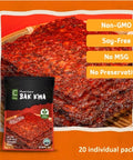 Introducing BAK KWA PLANT-BASED 160G 20PC - a delightful, plant-based alternative to traditional meat bak kwa. This Singaporean treat is made from high-quality soy protein, carefully infused with aromatic spices, sweetened with just the right amount of sugar, and given a smoky flavor through natural smoke. Each pack contains 20 individually wrapped pieces, making it a convenient and satisfying snack for those seeking a delicious meat-free option.
