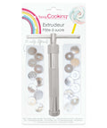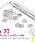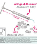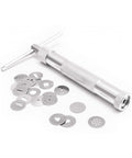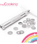 Extruder: Material: aluminium alloy Dimensions: 16.5 cm Discs: Material: Food grade stainless steel 20 different patterns Interchangeable discs Dimensions: Ø1.8 cm Cleaning instructions: Wipe with a slightly damp cloth before first use, and then after each use.
