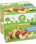 Introducing the Carrefour Assortment of Fruit Purees with No Added Sugar, a delightful mix of natural sweetness from the choicest of fruits. Each pack features a trio of purees - apple, apple-pear, and apple-peach, carefully prepared with 99.9% fruit content and a dash of antioxidant-rich ascorbic acid. Carrefour prioritizes your health by using only the freshest fruits and avoiding added sugars, making it a perfect choice for those looking for a healthy dessert or snack option.