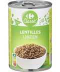 Experience the culinary essence of France with Carrefour's Small Can of Lentils. These lentils are pre-soaked and perfectly cooked, ready to add a nutritious boost to your meals with minimal preparation time. Known for their rich, earthy flavor and high protein and fiber content, lentils are a wholesome choice for a balanced diet. Despite being packed in a small can, their versatility in the kitchen is vast. Please note, this product may contain cereals (including wheat) containing gluten.