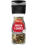 Experience the robust flavors and the warm, fragrant aroma of the Ducros 5 Whole Pepper Berries Blend Mill. This sophisticated blend of black, white, green, and pink pepper, along with coriander and allspice delivers an exquisite, full-bodied flavor and a gentle, harmonic kick to your dishes. Ducros, a renowned brand in the culinary world, takes pride in sourcing the finest ingredients that are carefully selected for their quality, freshness, and flavor. Each mill is designed with an adjustable grinder, allowing you to choose the coarseness of your spices, creating a personalized culinary experience.
