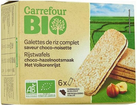 Indulge in the irresistible combination of organic, nutrient-dense ingredients and delectable chocolate with Carrefour's Organic Rice Thin Cakes Filled With Chocolate. Made with 50% organic brown rice and filled with a rich hazelnut paste, these light and crispy rice cakes offer a healthier alternative to traditional biscuits and sweets. Infused with a dash of low fat cocoa powder and a hint of natural vanilla flavor, these cakes are perfect for those looking to satisfy their sweet tooth without sacrificing health. Do note, they may contain traces of sesame, spelt, milk and soya.