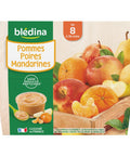 Introducing Blédina's Apple, Pear and Mandarin Compote for Babies, a succulent and nutritious fruit blend specially formulated for your little ones. Made with 66.9% apple, 25% pear, and 8% organic mandarin juice, this delightful compote is packed with essential vitamins like vitamin C. Depending on the acidity of the fruit, it may also contain concentrated lemon juice, providing an extra burst of flavor and nutrition. Perfect for babies aged eight months and older, this compote promises a great taste while supporting their healthy growth and development.