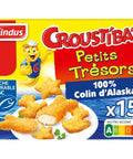 Experience a delicious and fun way to enjoy fish with Petits Trésors Croustibat, Breaded Fish by Findus. Made with 51% Alaska Pollock, this delightful treat is perfect for kids and adults alike. Each piece is coated in a tasty breadcrumb mixture, infused with a blend of spices, onion, and garlic powder for a subtle kick of flavors. The breaded fish is then fried to a golden crisp, offering a scrumptious crunch with every bite. With no artificial colors or flavors, it's a healthier alternative to traditional fast food. Please take note that although every effort has been made to remove all bones, some may still be present.
