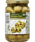 Savor the lush, tangy taste of Carrefour Pitted Green Olives. These vibrant gems, harvested from the sun-drenched groves of France, are soaked in a simple brine of water, salt, and citric acid to preserve their natural flavor and firm texture. Ideal for the discerning palate, these green olives make an excellent component in your culinary creations or simply as a wholesome, savory snack that's also a good source of dietary fibers and healthy fats.