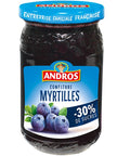 Indulge in the delicate and refreshing taste of blueberries with Andros Reduced Sugar Blueberry Jam. Crafted with a careful balance of luscious blueberries and just the right amount of sugar, it offers a healthier alternative for those looking to enjoy their favorite spreads guilt-free. Its natural formulation, enriched with fruit pectin as a gelling agent, guarantees a consistent, full-bodied texture. This product is a standout in the SWEET GROCERIES category, perfect for those who crave the delicious tang of blueberries, but prefer a reduced sugar option.