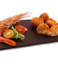 Serve Croquetas De Gambon Al Ajillo Artesanales as a tapas-style sharing plate, topped with a pinch of fresh parsley and a squeeze of lemon for a refreshing twist. Also, include them as a side dish to a plate of Paella for a true Spanish dining experience. The creamy and savory flavors of the croquettes complement well with tangy and spicy dips, making them an excellent addition to a party snack platter. Lastly, these croquettes can be included in your brunch menu as a side dish to scrambled eggs or a Spanish omelette.