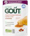 Good Goût's Organic Butternut Squash, Coral Lentil, and Hazelnut Soup is a wholesome meal perfect for your little ones. Made from 74% organic butternut squash, this soup is rich in vitamins A and C, key nutrients for your baby's immune system and eyesight. The coral lentils and hazelnut powder add a delightful texture and a burst of flavors, while providing essential proteins and healthy fats for your baby's growth and development. Certified organic and free from artificial additives, this soup is a safe and nutritious choice for babies from 6 months onwards.