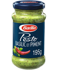 Savour the intense flavours of Italy with Barilla's Basil and Chilli Pesto Sauce. Crafted with care, this sauce is a unique blend of aromatic basil, fiery chilli, and luscious sunflower oil. A hint of Cajounut and a dash of green pepper add an unexpected twist, while natural flavours and an infusion of milk protein ensure a velvety texture and a delightful culinary experience. Whether you're spicing up a pasta dish or adding a kick to your favourite recipes, this sauce is the perfect condiment for those who enjoy a bit of heat in their meals. It's perfect for spicing up everyday dishes with a touch of Italian gourmet flair.
