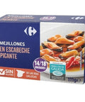 Experience the rich, robust flavours of Spain with Carrefour Espana's Mussels in Spicy Escabeche Sauce. These mejillones en escabeche picante are wholesome mussels preserved in a tangy sauce made with sunflower oil, wine vinegar, and a blend of spicy paprika, cayenne pepper, bay leaf, garlic, and onion. The natural chilli flavouring adds an extra kick, making them a perfect choice for those who enjoy a bit of heat. Quick and convenient, they are a true ally for your spur-of-the-moment appetizers.