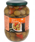 Introducing the Carrefour Espana's Aceitunas Verdes Manzanilla Partidas y Aliñadas, an exquisite blend of Green Manzanilla Olives, split and seasoned to perfection. Handpicked under the Spanish sun, these lush, juicy olives are then seasoned with gourmet ingredients like pepper, garlic, cumin, oregano, and paprika, resulting in a zesty and tantalizing taste that's sure to wow your taste buds. With their rich, full-bodied flavour and luscious texture, these olives are a culinary delight, a real treat for the gourmet palate.